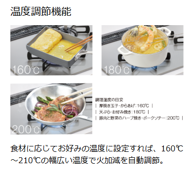 - 食材に応じてお好みの温度に設定すれば、160℃~210℃の幅広い温度で火加減を自動調節。