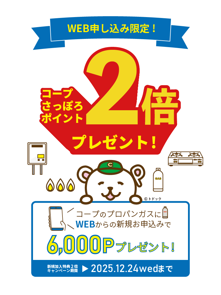 お取り扱い地域の戸建住宅にお住まいで、プロパンガスを現在ご利用の組合員さんならどなたでもご利用いただけます。未加入の方の組合員加入の手続きも簡単です。詳しくは「コープさっぽろ」のホームページをご確認ください。