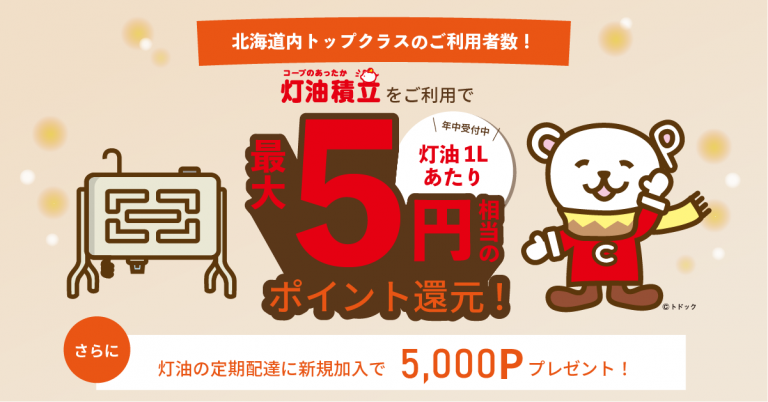 新規加入特典5,000ポイントもらえる!安心&お得なコープの灯油定期配達北海道の冬もこれで安心。 コープさっぽろの「灯油の定期配達」で、あったかい冬と家計のゆとりを手に入れましょう!新…