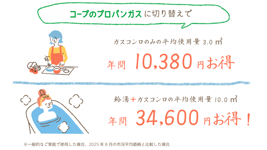 これを一般的な家庭で1ヶ月3.0㎥を使用した場合で計算すると、年間10,380円も安くなるんです。