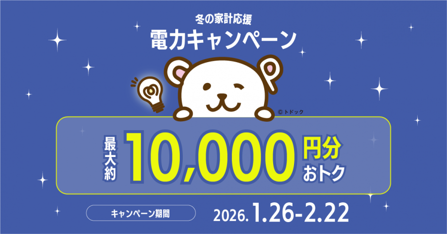 キャンペーン でんき 2026.01.19 約10,000円分相当お得!冬の家計応援 電力キャンペーン開始 冬の家計応援電力キャンペーンが始まります。コープのでんきに切り替えとコープの店舗、または宅配トドックをご利用で、なんと約10,000円分相当お得になります。期間は2026年1月26日(月)から2月22日(日)まで!今がオトクです。