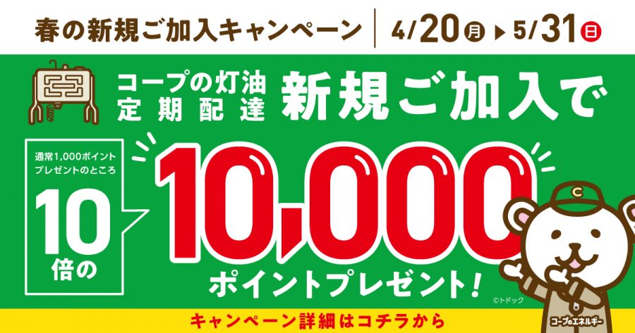 コープの灯油の定期配達に新規加入で通常1,000Pプレゼントのところ、10倍の10,000Pプレゼント!キャンペーン期間は、2026年4月20日(月)から5月31日(日)です。